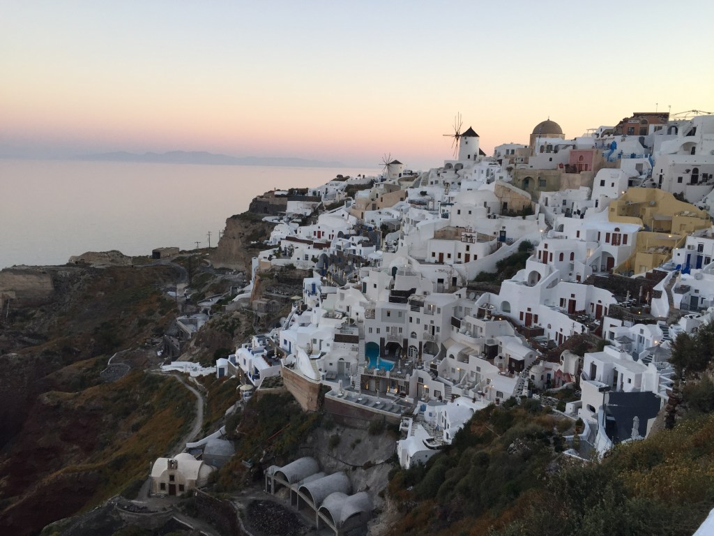 - Santorini: A crescent shaped island famous for the northern most city of Oia atop rugged cliffs. This is the social media hot spot with its stunning sunsets amidst white-washed buildings and blue roofs, resulting in large tourist crowds and expensive accommodations. It is also the farthest city from the airport requiring transportation. Once there, you must haul luggage across stairs carved into the cliffside. However, it is a bucket list item with high-end restaurants, unique hotels, and good excursions, like sunset cruises and the winery at the bottom of the cliff. The Island has other large cities closer to the airport and beautiful beaches like Red Beach and Perissa Beach. These other cities can provide serene relaxation or a min-Mykonos vibrant nightlife. A must-do for the active is to hike the donkey trail from Imerovigli to Santorini (or vice-versa) which provides an expansive lookout across the crisp blue waters of the Caldera and Aegean.
